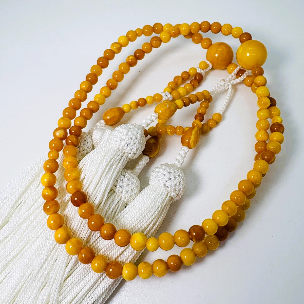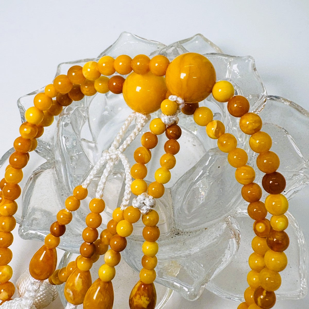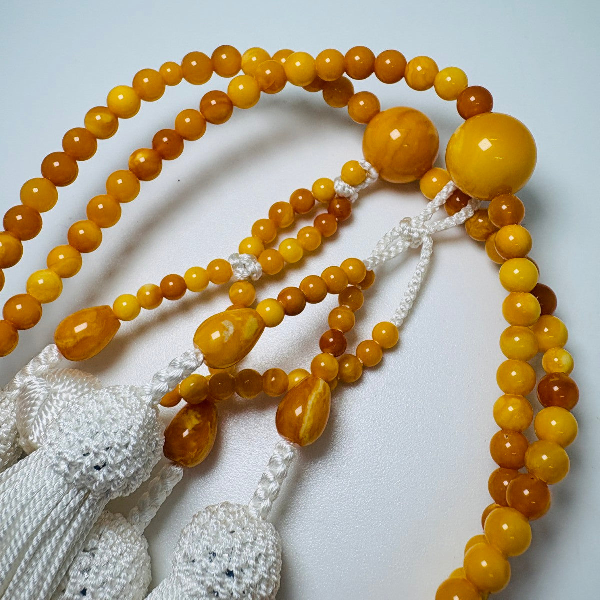 日蓮宗僧侶用珠数です。希少価値の琥珀(中国産)の中から、最高級の磨きで仕上がっております。